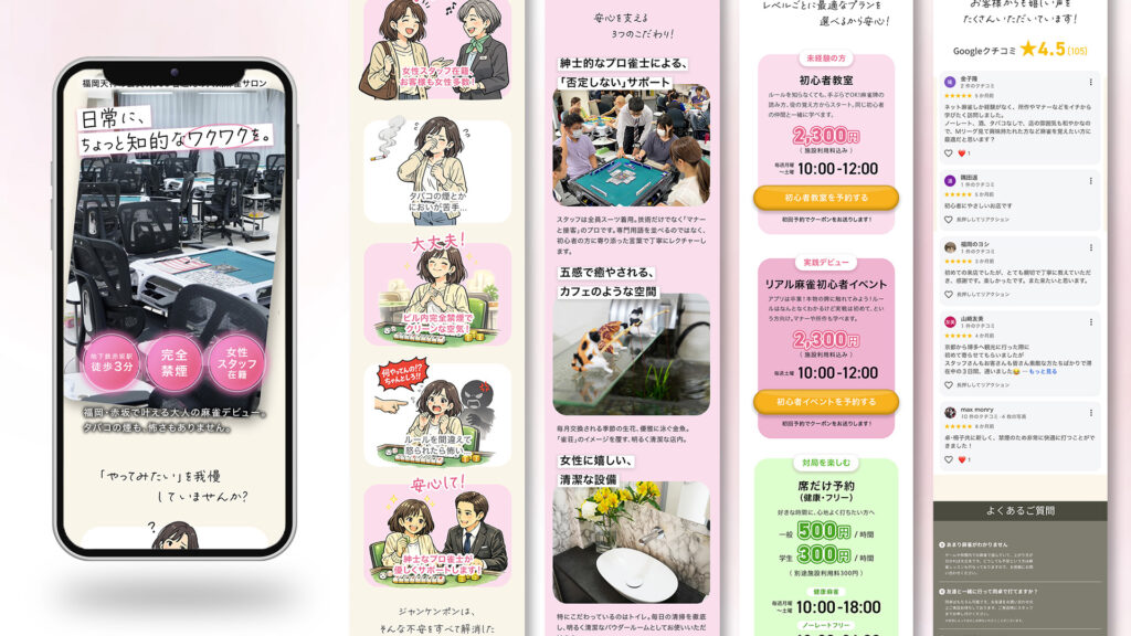 福岡天神にある、健康麻雀・ノーレートフリーの雀荘店 雀ケンポン様のLPを制作させていただきました。